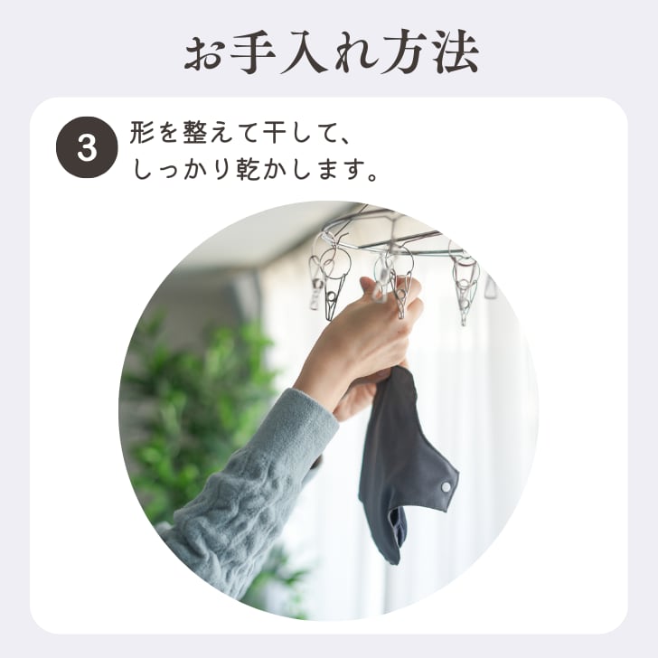 ・製品の劣化を防ぐため乾燥機の使用は避けていただき、陰干しいただくことを推奨しております。